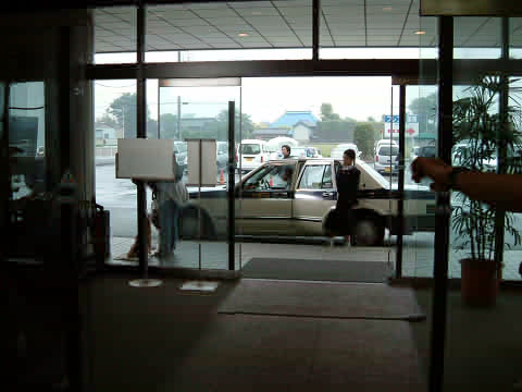 本庄総合病院の入り口にて、まずはぬいぐるみでテスト