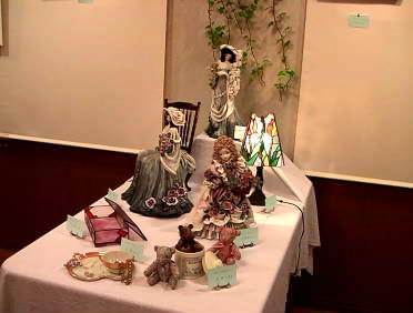 このテーブルに置かれているものは、ドールアート、ガラス工芸、 ぬいぐるみ人形、ビーズ細工などです