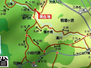 今回のコースは、地図左上の「湯滝」から「小滝」まで下の遠回りの道