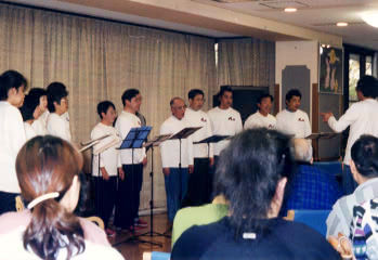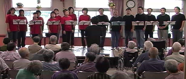 とにかく練習だけでなく、時々人前で歌わなければダメだけれど、往年のような曲目を並べて定期演奏会を開くには力が足りない。自分たちの勉強を兼ねて何か社会の役にも立ちたい。そこで断腸、いや、団長の学さんがひねり出したアイディア、老人ホーム訪問の出前コンサート! 昨年秋(2001年11月・12月)に、特別養護老人ホーム「安誠園」と福島病院に併設の介護老人保健施設「彩の苑」へ行ってきました。この機会に特別参加して下さった小原夫妻、天笠(旧姓神田)さんや音大受験準備中の寺島君、これだけ揃うと、貧弱だったアンサンブルが元気を取り戻します。新編曲の小学唱歌集、お得意のアカペラ童謡「赤い靴」や「浜千鳥」、ダマ・ソロを加えた「一茶さん」など、喜んでいただけたと自負しています。かつてスクール・コンサートで小学生たちに歓迎された「ボランティアの本混」再現をめざして、これからも歌う機会を増やし、歌心が錆びつかぬよう、磨きをかけたいと思います。