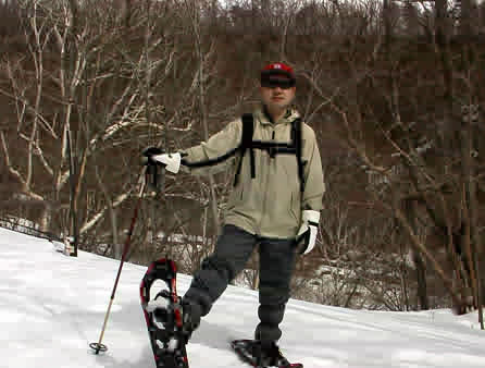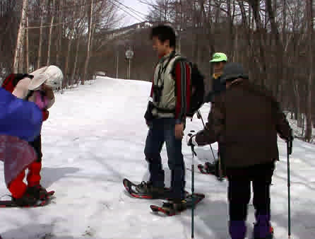 さあ、スノーシューを履いて出発。ガイド1人と参加者6人。