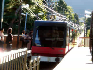 強羅からは斜め車両のケーブルカーです。線路に2本のケーブルが。