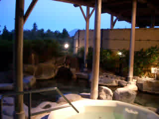 露天風呂の全景です。「富士見酒(無料)」というサービスは、