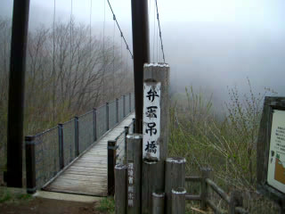 休暇村の前から歩き始めました。吊り橋を渡って霧の中へ。